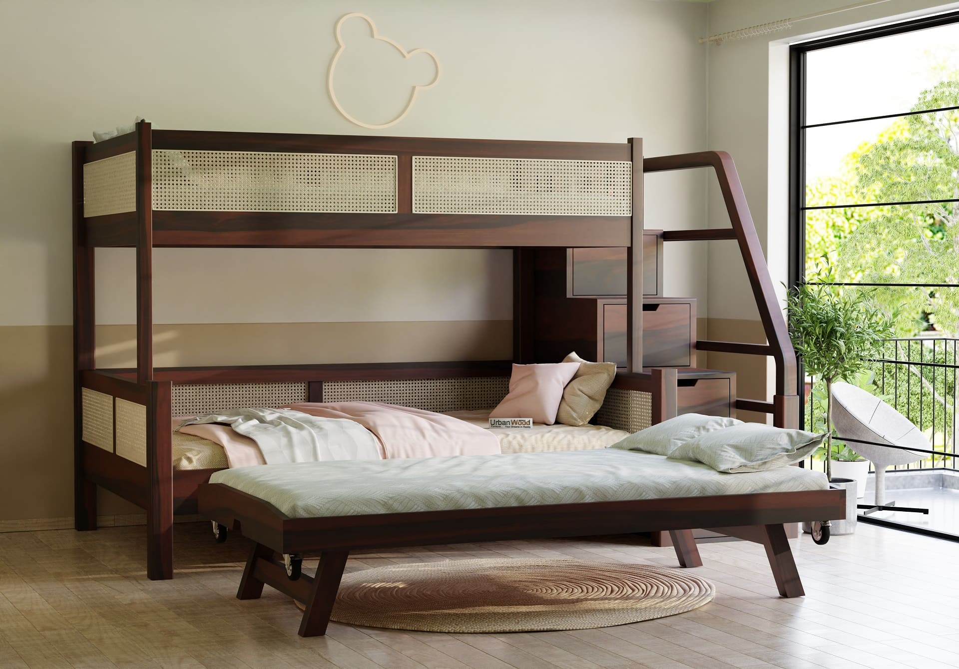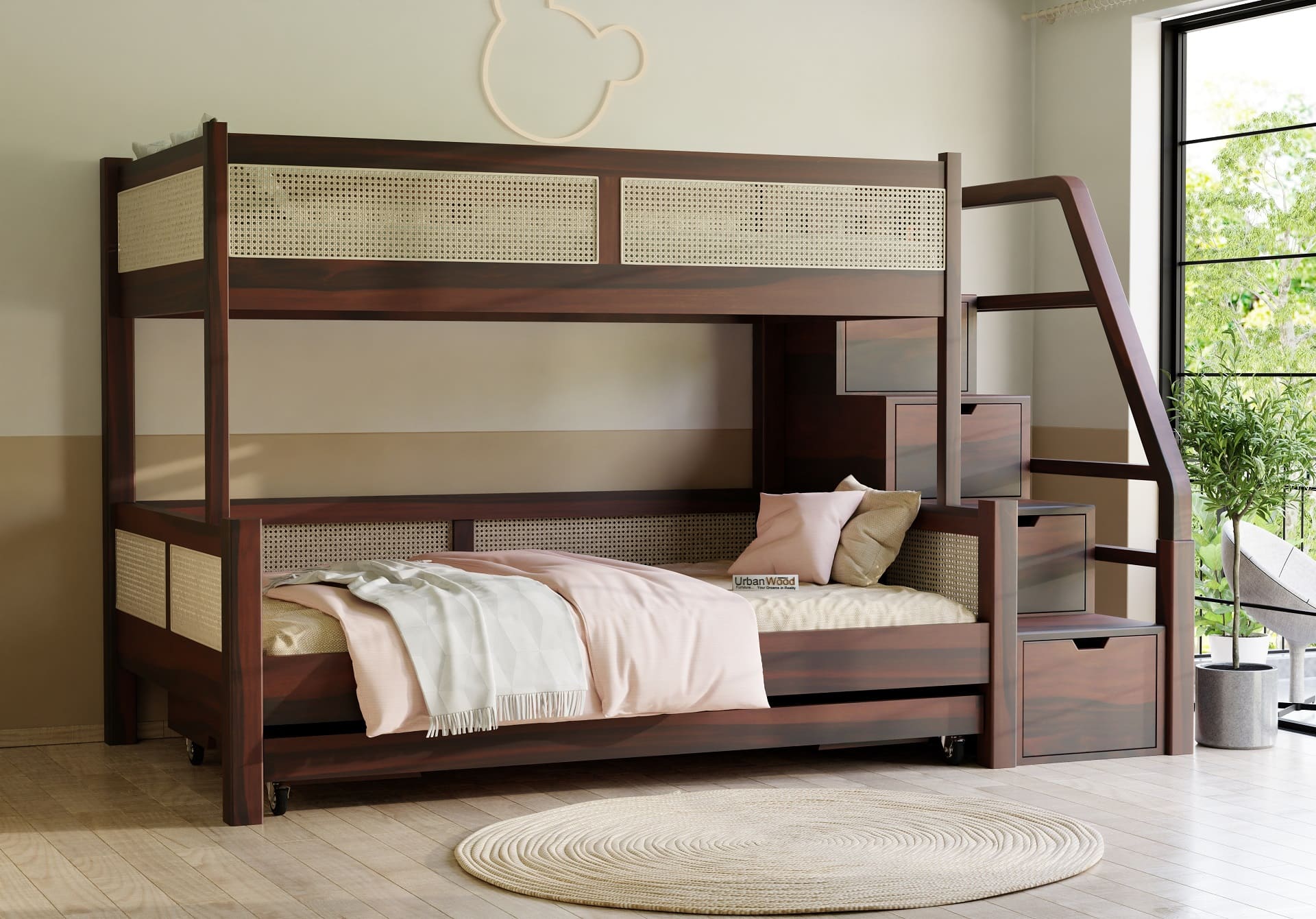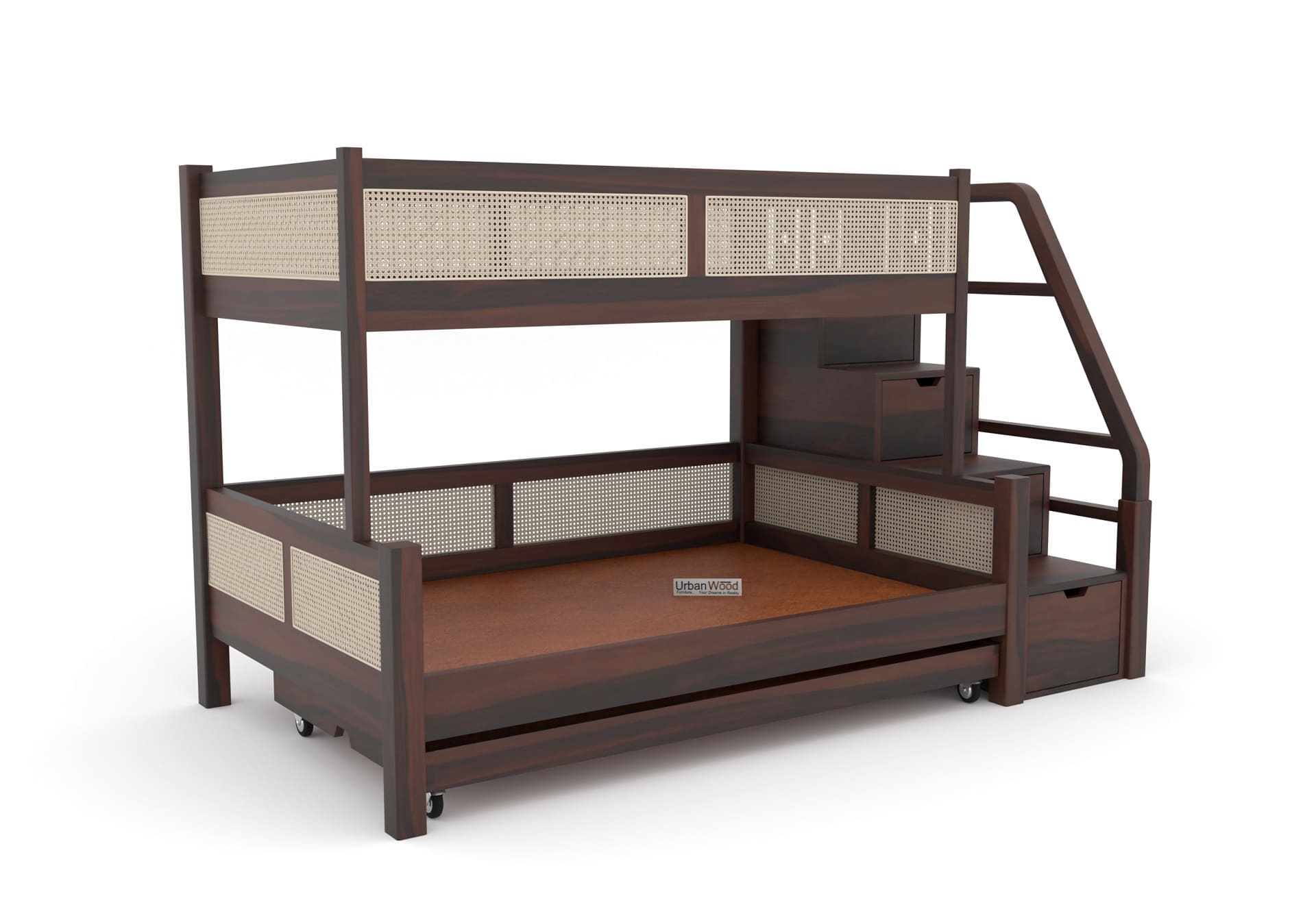 Stark Bunk Bed With Cane And Trundle (Walnut Finish)