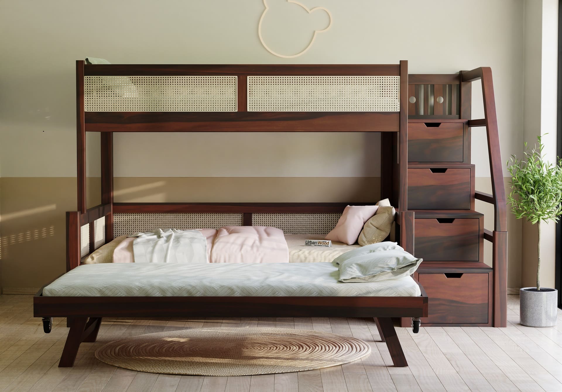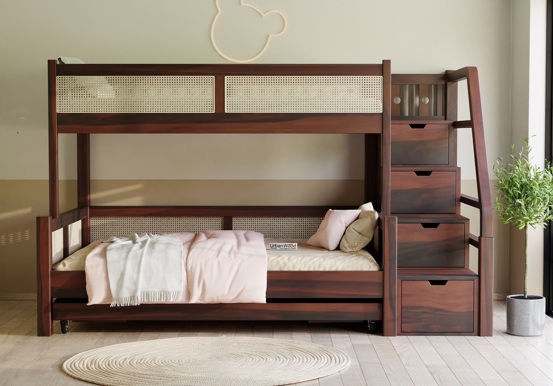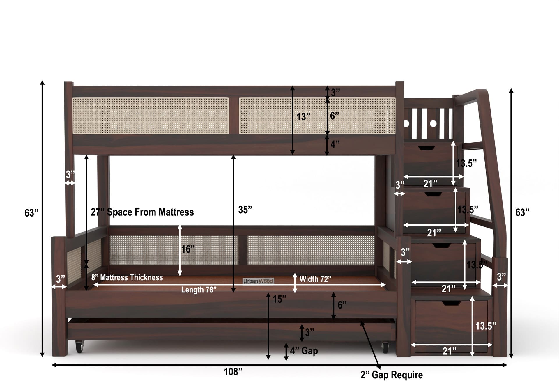 Stark Bunk Bed With Cane And Trundle (Walnut Finish)